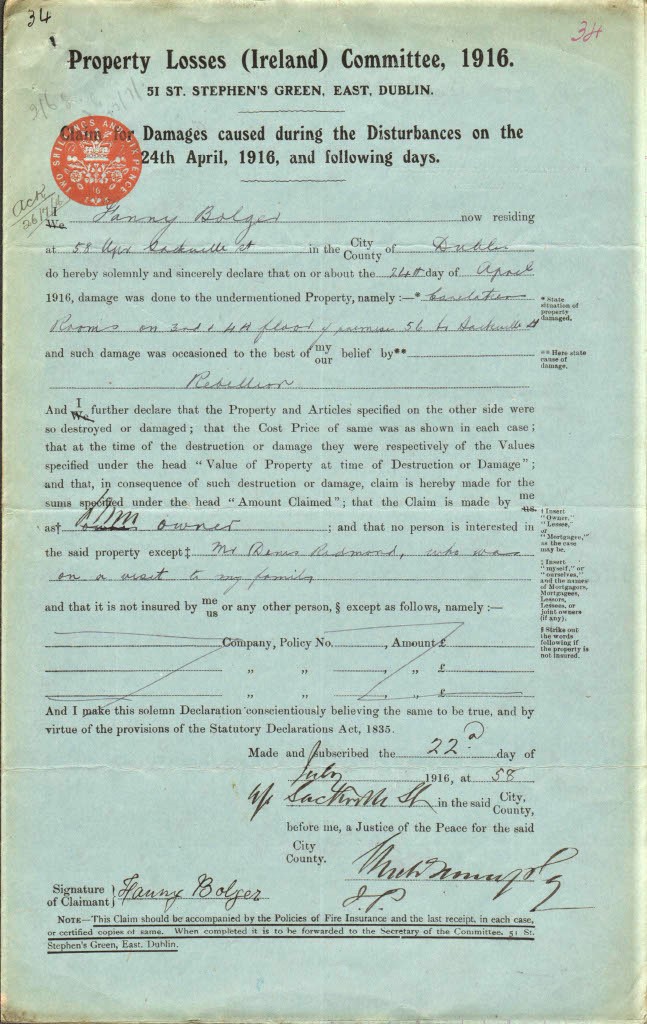 According to the record of the Property Losses Committee, Fanny Bolger put in a claim for £44 and 3 shillings to cover her lost possessions. She was paid £44 and 15 shillings.